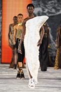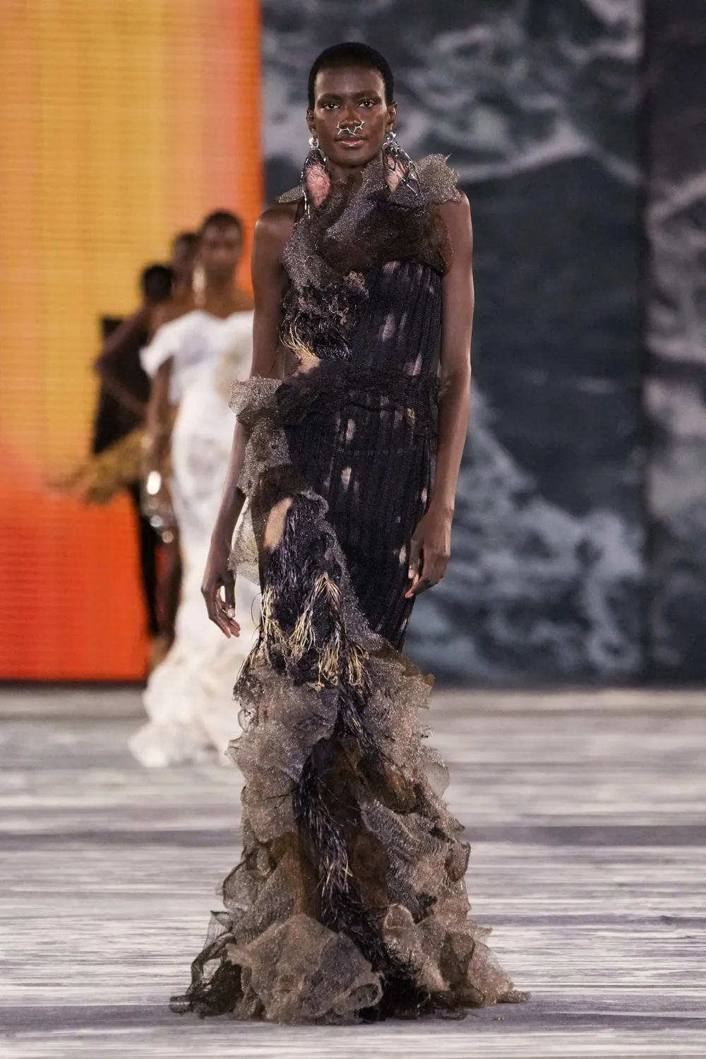 Conjuntos de terno e calça em cetim e linho, casacos atoalhados, camisas de algodão, saias e bermudas em couro típicas da coleção de prêt-à-porter deram a deixa para a sequência final de vestidos de couture, desfilados unicamente por modelos negras.