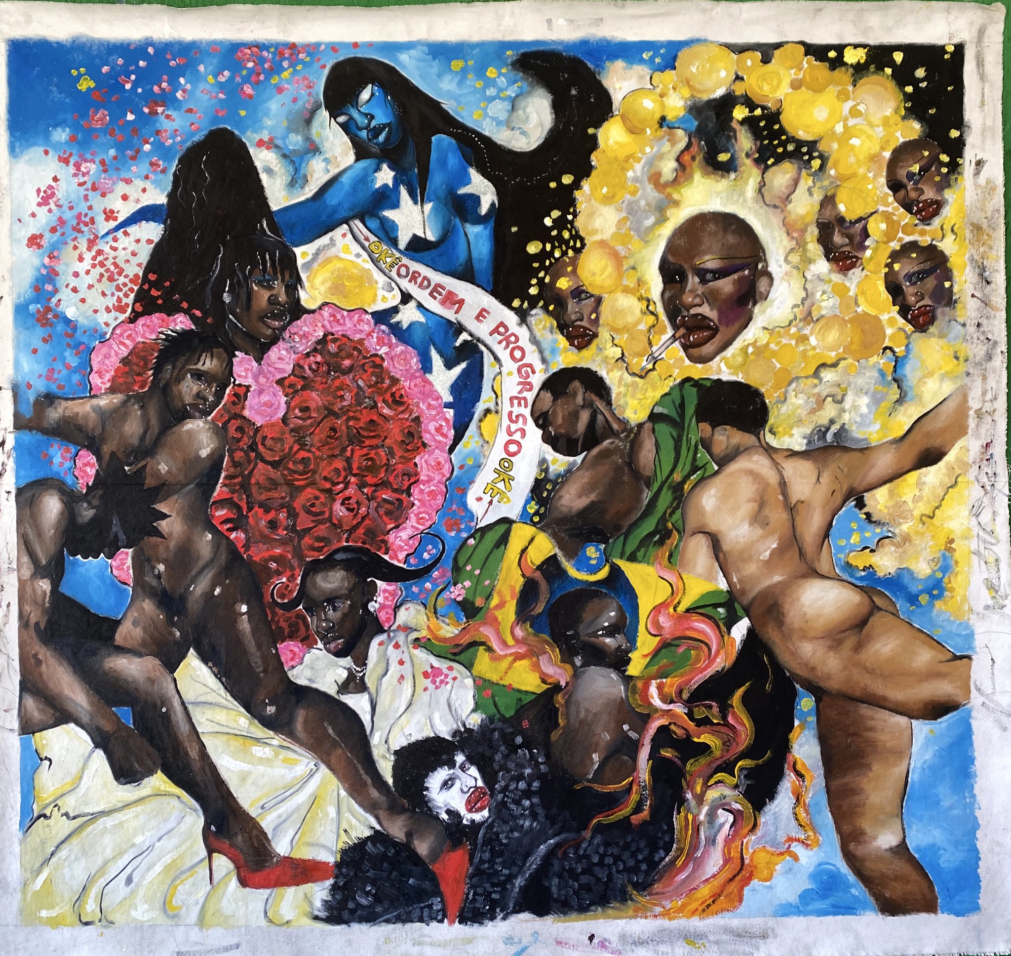 O artista visual Isaac Sales cria a partir do corpo, da memória e da política. Nascido em São Paulo e criado na periferia de Guarulhos, iniciou sua trajetória pela dança e pelo carnaval, linguagens que ainda atravessam sua pintura, marcada pelo movimento, pela teatralidade e pelo uso alegórico das imagens.