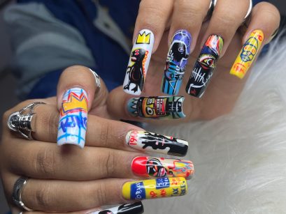 Sim! Teve uma que me marcou muito, foi uma unha inspirada nas obras do Basquiat, um artista incrível que me inspira bastante nos trabalhos de criação à mão livre, principalmente quando desenho direto na unha. Eu já tinha feito algo parecido antes, mas eram unhas curtinhas. E eu amo unha curta, mas quando eu fiz essa versão em unhas bem longas de uns 5 centímetros foi simplesmente sensacional.