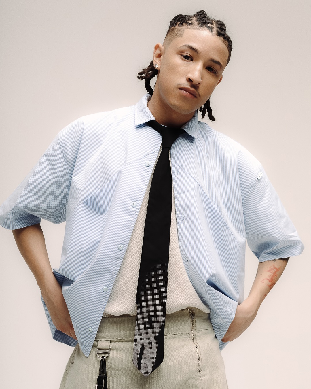 Hoje, a Elo em Comum vai muito além de roupas: cada detalhe das modelagens às estampas, dos recortes aos acabamentos é pensado para expressar identidade, conceito e presença. Um exemplo disso são as curvas, que viraram símbolo da marca. “As curvas acabaram virando nossa marca registrada de forma intencional”, diz Vinícius. Outros elementos recorrentes, como a corrente, também ajudam a criar uma linguagem visual própria.