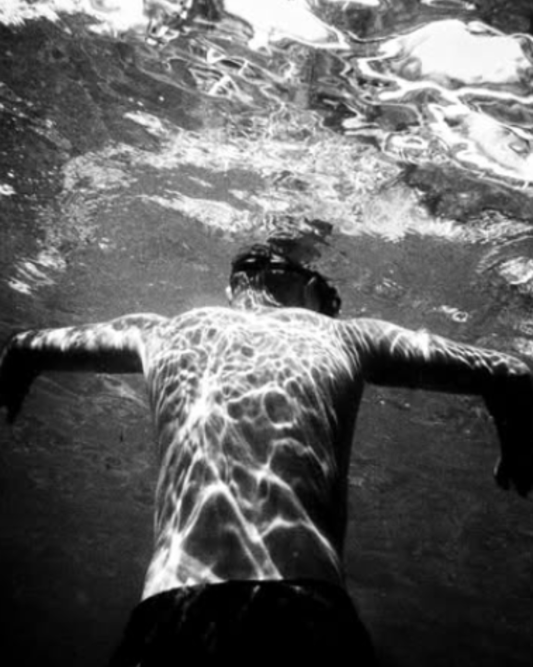 Além disso, as imagens, capturadas em filme fotográfico, refletem a experiência sensorial do mergulho e da convivência com o mar, evidenciando a conexão profunda entre corpo e água.