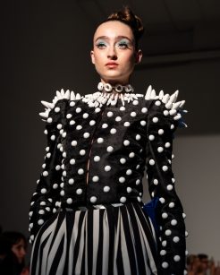 Conhecido por seu compromisso com o upcycling, van der Kemp mais uma vez utilizou tecidos de arquivo, excedentes da indústria de luxo e técnicas artesanais para dar forma a looks que celebram diversidade e consciência ambiental. As peças, marcadas por volumes expressivos e construções elaboradas, dialogaram diretamente com a beleza desenvolvida por Marcello. Este combinou referências de diferentes décadas com uma linguagem atual e sofisticada.