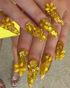 Um dos modelos mais comentados foi de Zara Larsson, que exibiu unhas em forma de amêndoa adornadas com pérolas, contas e paetês, criadas para complementar seu look personalizado. Esse design tridimensional transmitiu um efeito multidimensional que dialogou diretamente com seu vestido glamouroso, misturando brilho, textura e exuberância.