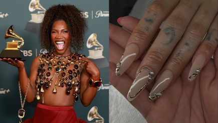 Outros destaques incluíram Doechii, com um French cobre‑cromado coordenado com sua pedicure. Também Kehlani, com unhas longas em formato stiletto decoradas com elementos cromados e pérolas, agregando elegância ao seu look premiado.