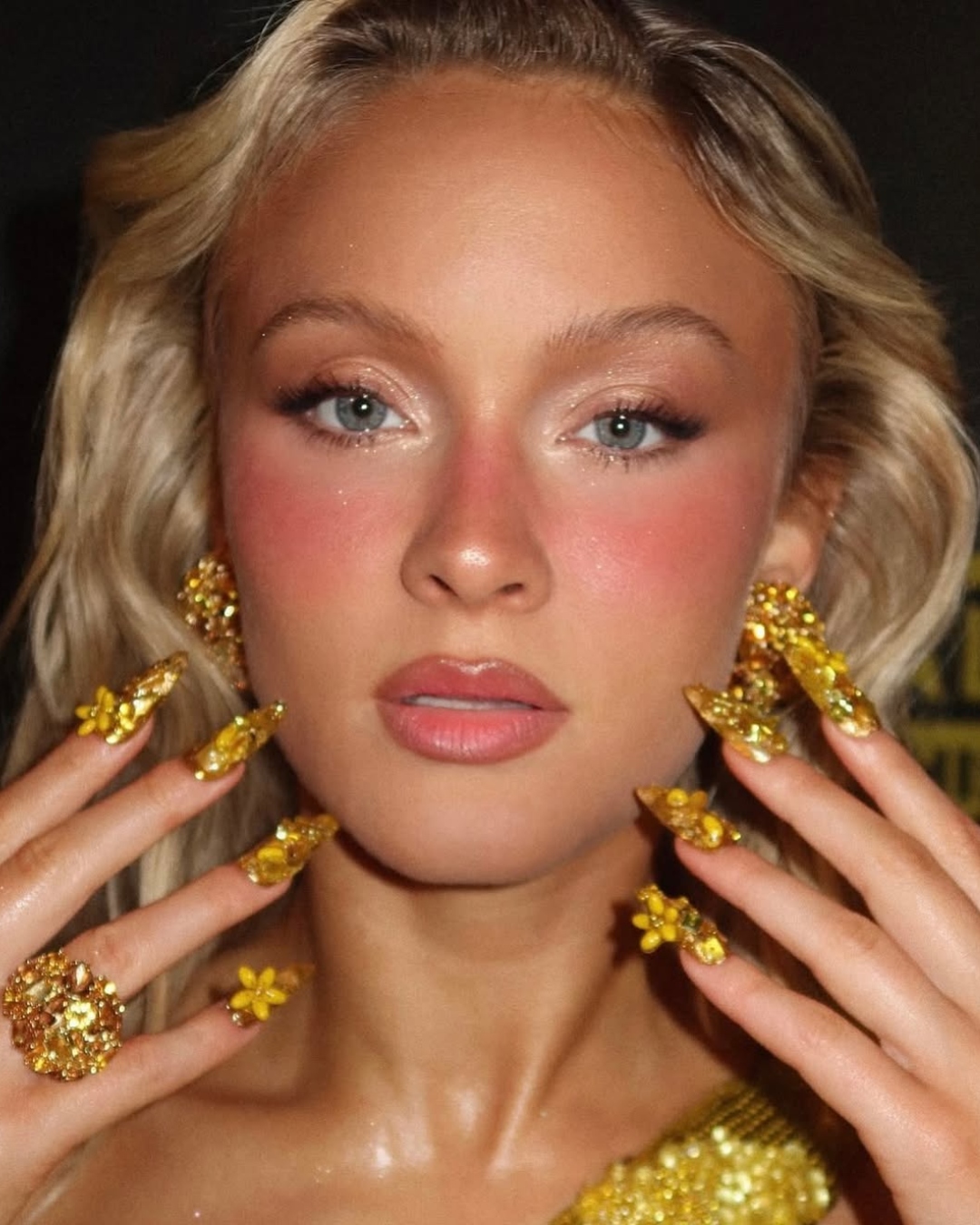 Um dos modelos mais comentados foi de Zara Larsson, que exibiu unhas em forma de amêndoa adornadas com pérolas, contas e paetês, criadas para complementar seu look personalizado. Esse design tridimensional transmitiu um efeito multidimensional que dialogou diretamente com seu vestido glamouroso, misturando brilho, textura e exuberância.