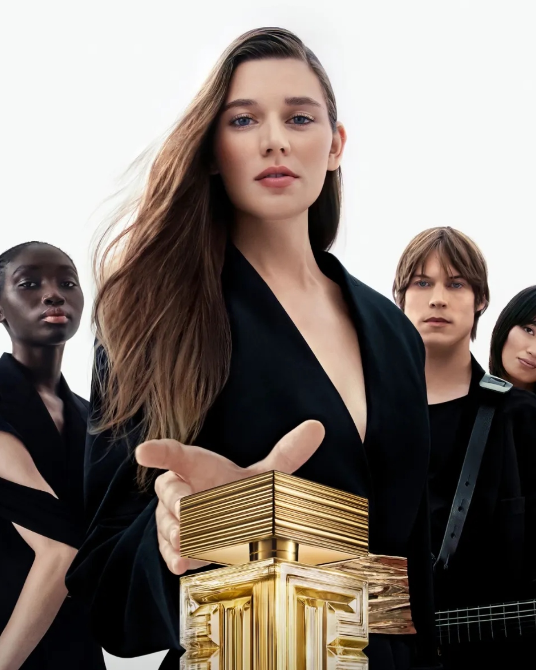 Além da composição, o frasco é um elemento de estilo que merece destaque. Um cubo de vidro refillável com detalhes em dourado, ornamentado com o monograma “PB” gravado em um motivo tridimensional inspirado no Labyrinth, símbolo visual da Balmain.