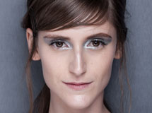 A pele foi preparada com a base Face and Body; nos olhos, o pigmento Silver garante o prateado que dá força à produção. Arrematada por cílios postiços e máscaras nas pestanas superiores, a maquiagem vai na contra-mão da claridade nos cílios, mas não se ausenta do frescor dos pontos de luz.
