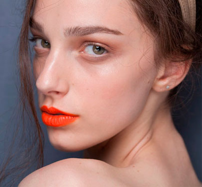 O efeito iluminado no contorno do rosto foi feito com o Météorites Perles du Paradise da Guerlain. O blush é o Puerto Vallarta, da Nars. O destaque do make ficou por conta do gloss laranja Lip Tar Androgyne, da marca Obsessive Compulsive Cosmetics.