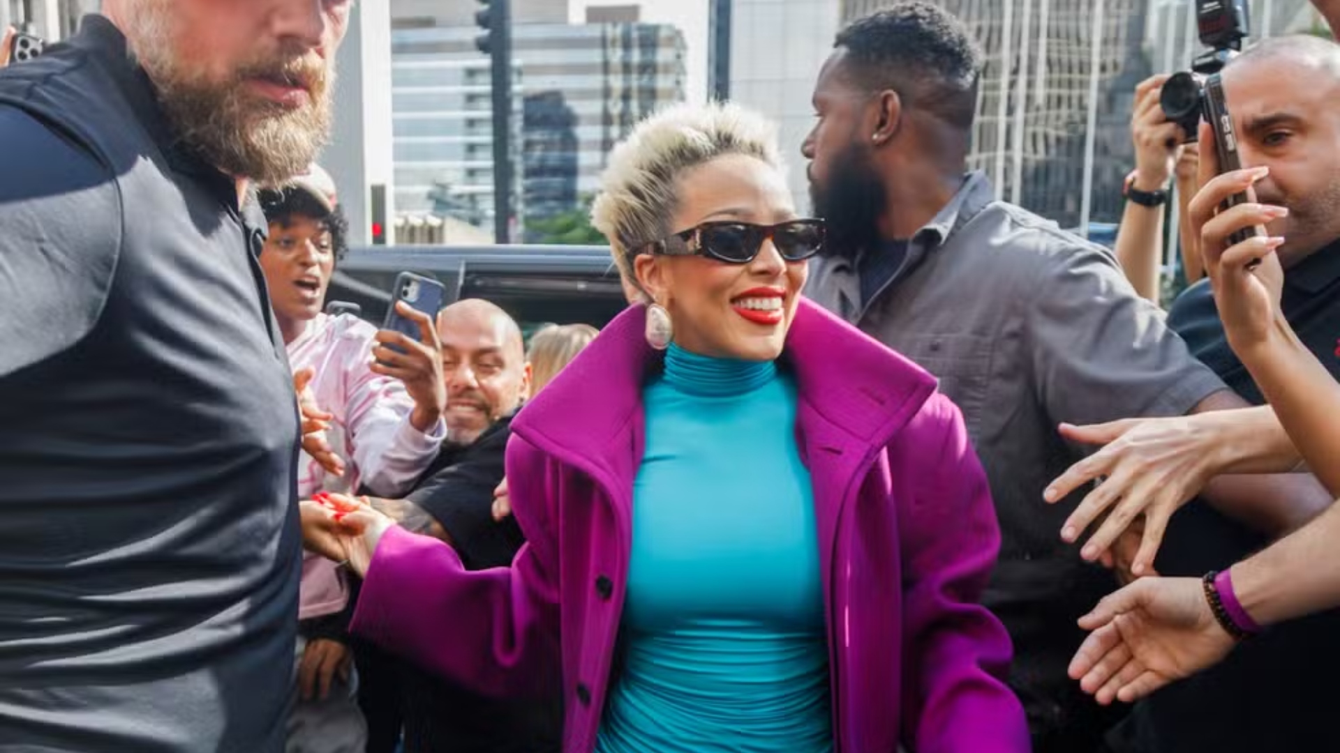 Para sua visita à loja em São Paulo, a estrela apostou em um visual moderno e chamativo. Ela escolheu um vestido justo azul de gola, com um detalhe brilhante e um sobretudo roxo. Além disso, ela também estava com uma meia calça preta, um salto e óculos escuros, deixando o visual ainda mais estilizado.
