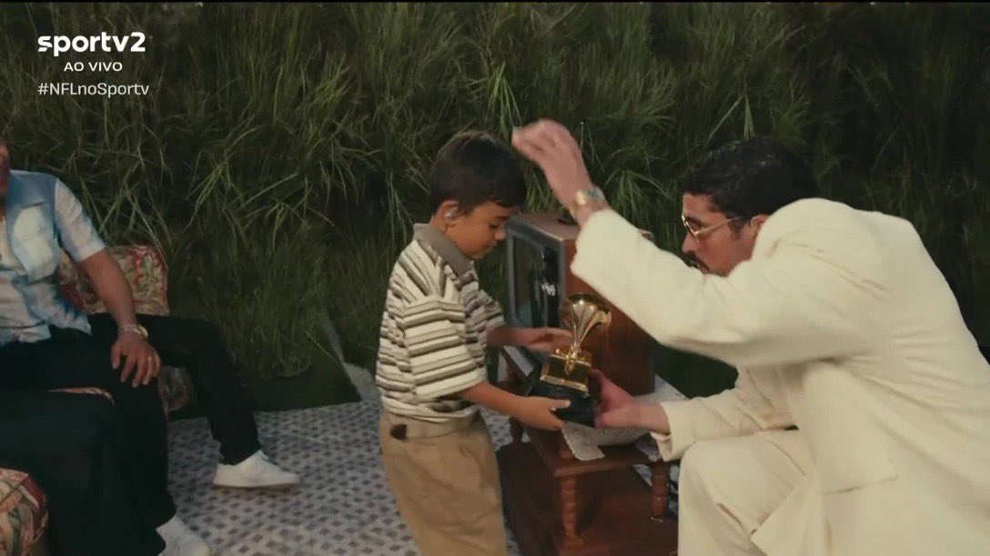 O garoto que recebe o Grammy das mãos de Bad Bunny, na sala com sua família, representa o jovem Benito que um dia sonhava em ser artista.