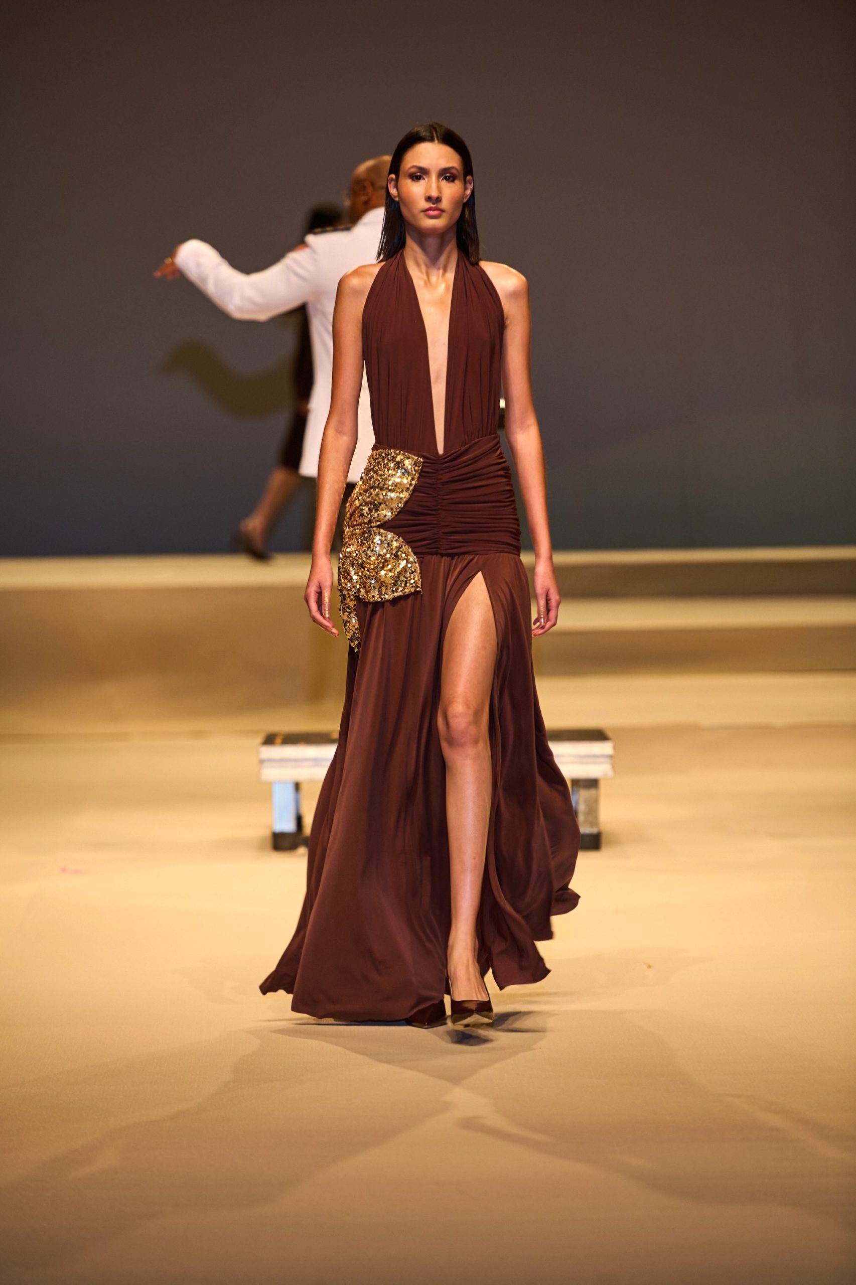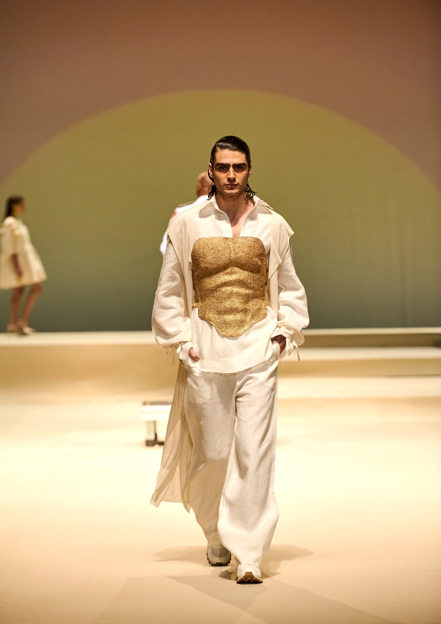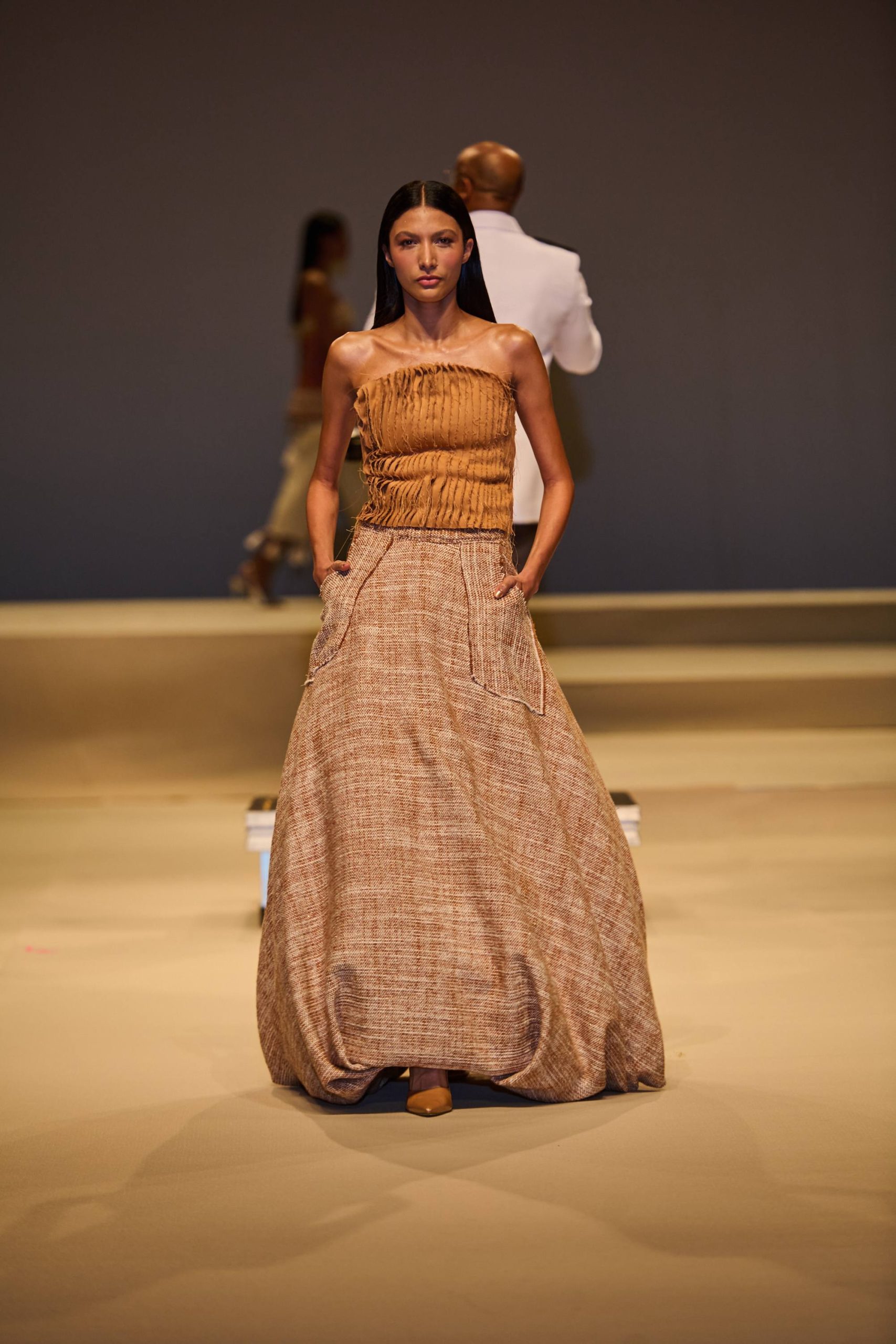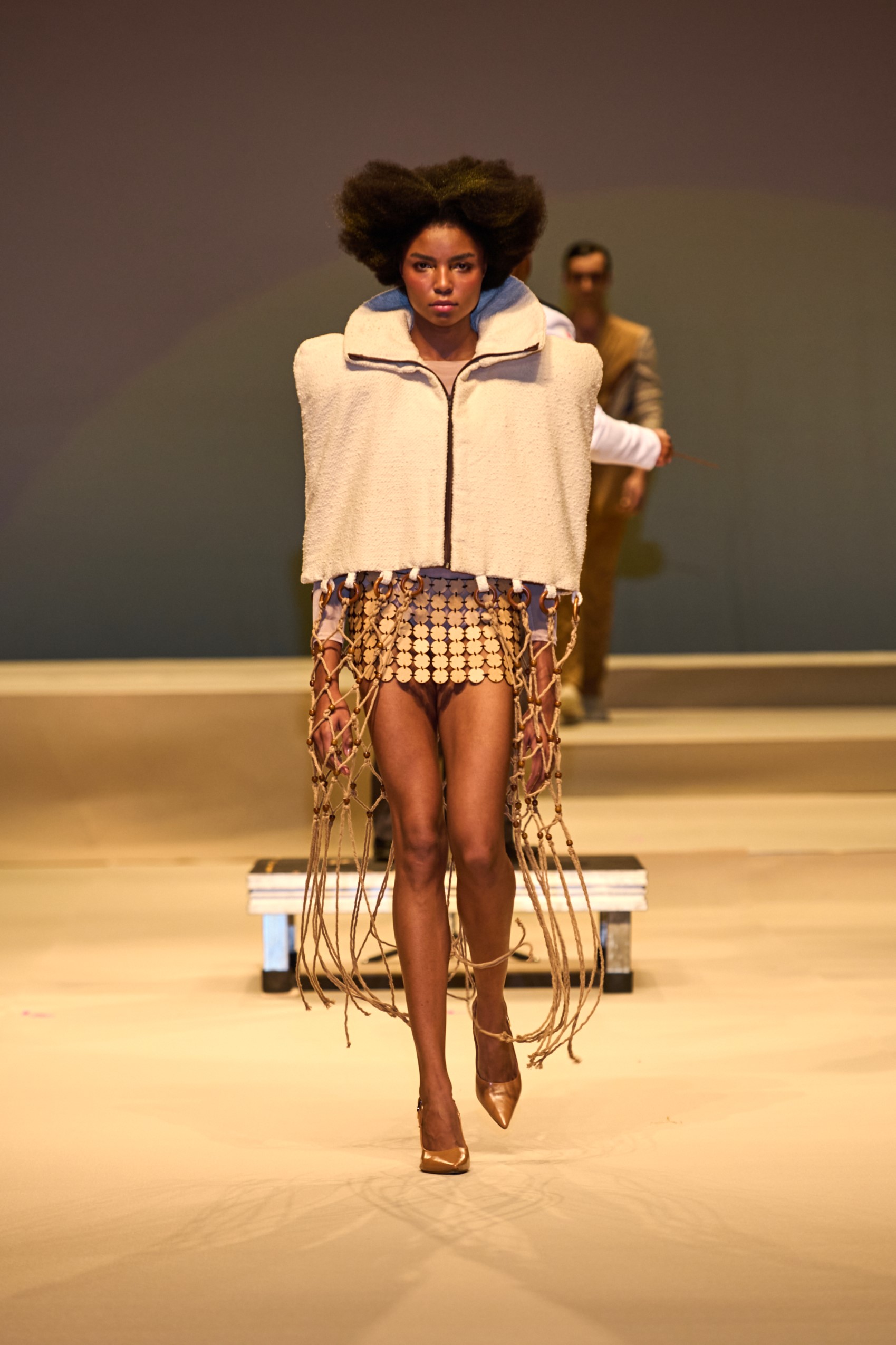 Na passarela, uma sequência de looks autorais trouxeram referências ao artesanato do Vale do Jequitinhonha, às pedras naturais, aos bordados, aos traçados e à cestaria. As produções, cada uma assinada por um designer, começaram em tons claros, como off-white, e evoluíram para nuances de marrom, caramelo, dourado, vermelho e terracota. Volumes amplos, tecidos fluidos e modelagens que favorecem o balanço dos corpos revelaram um retrato sensível e elegante do feito à mão mineiro.