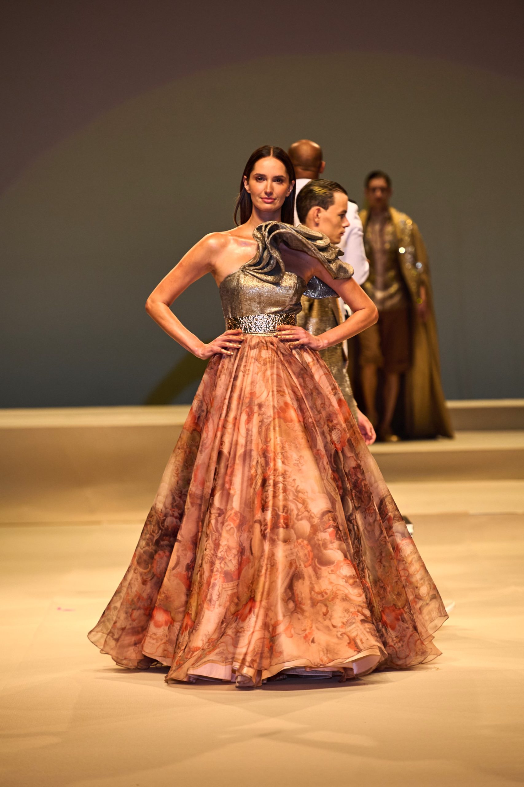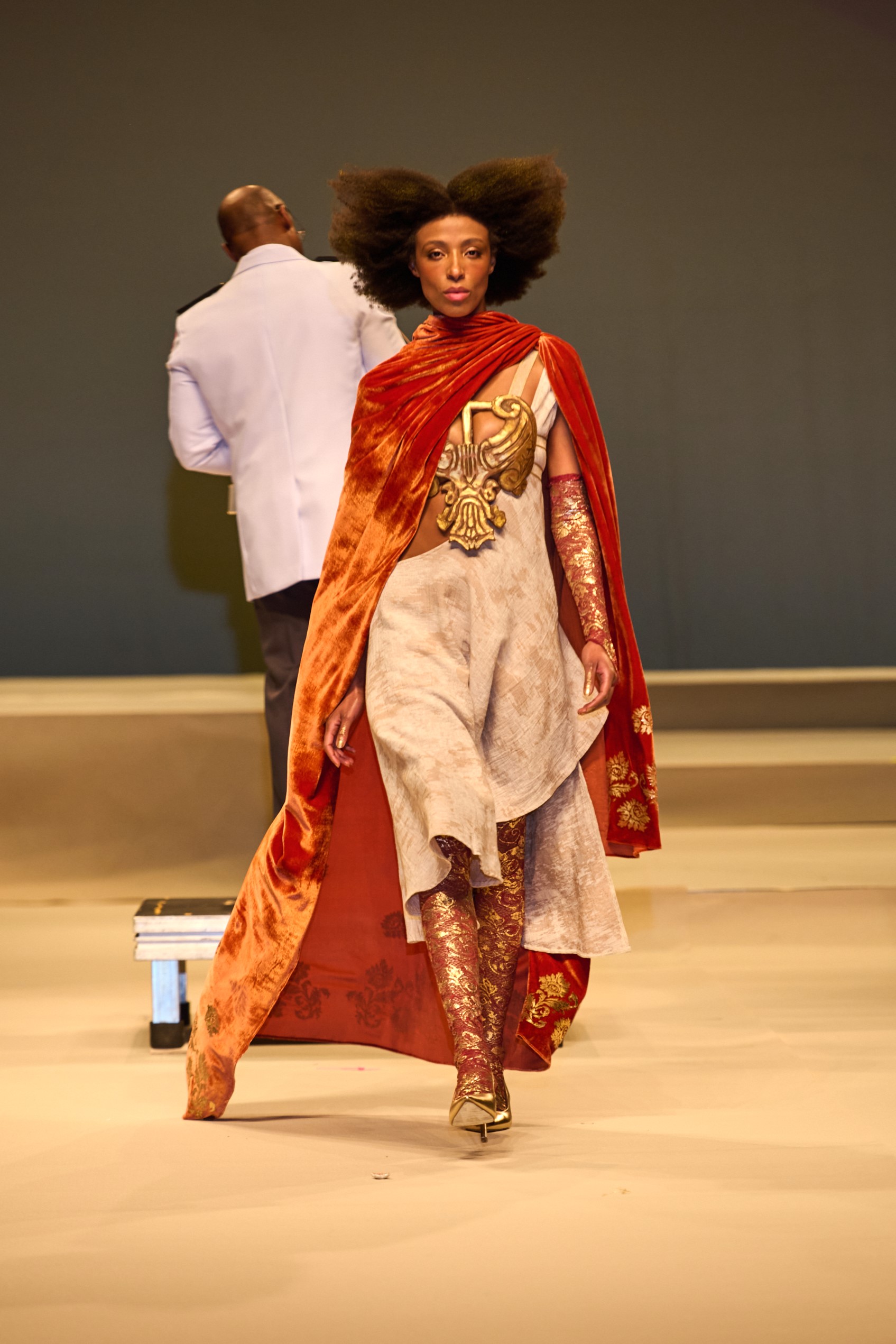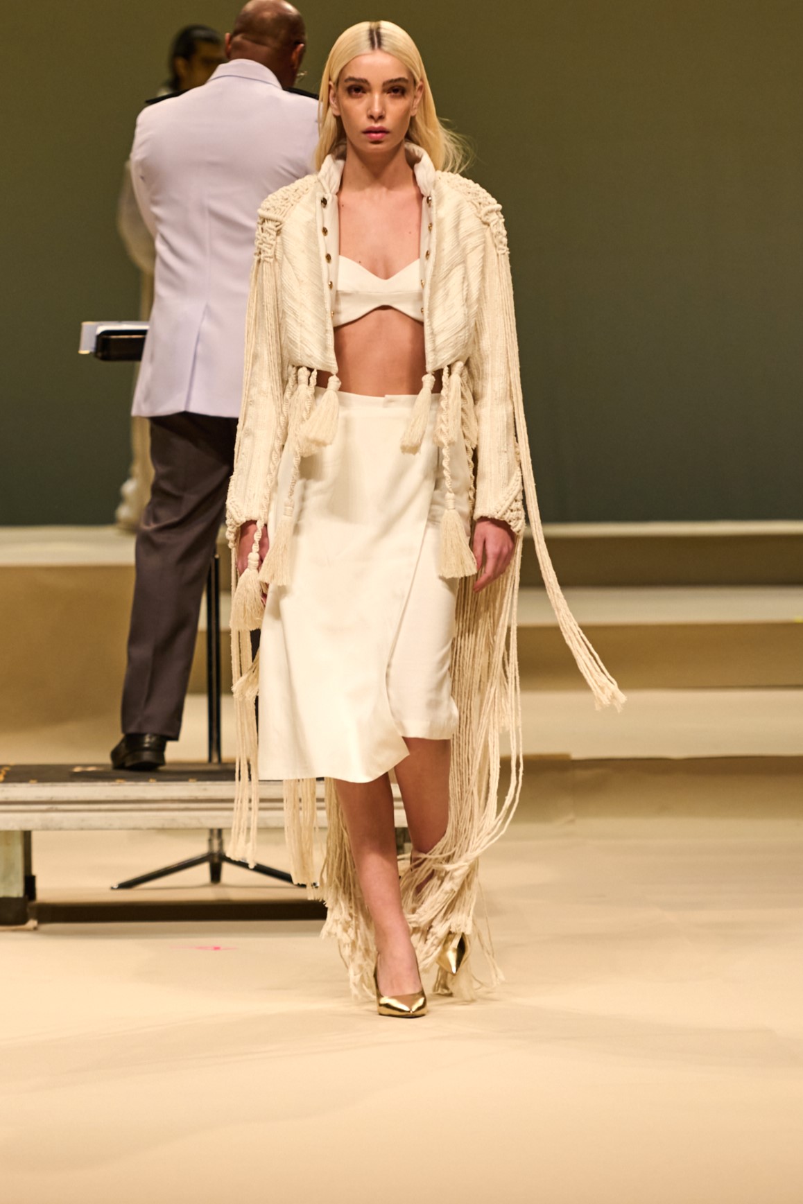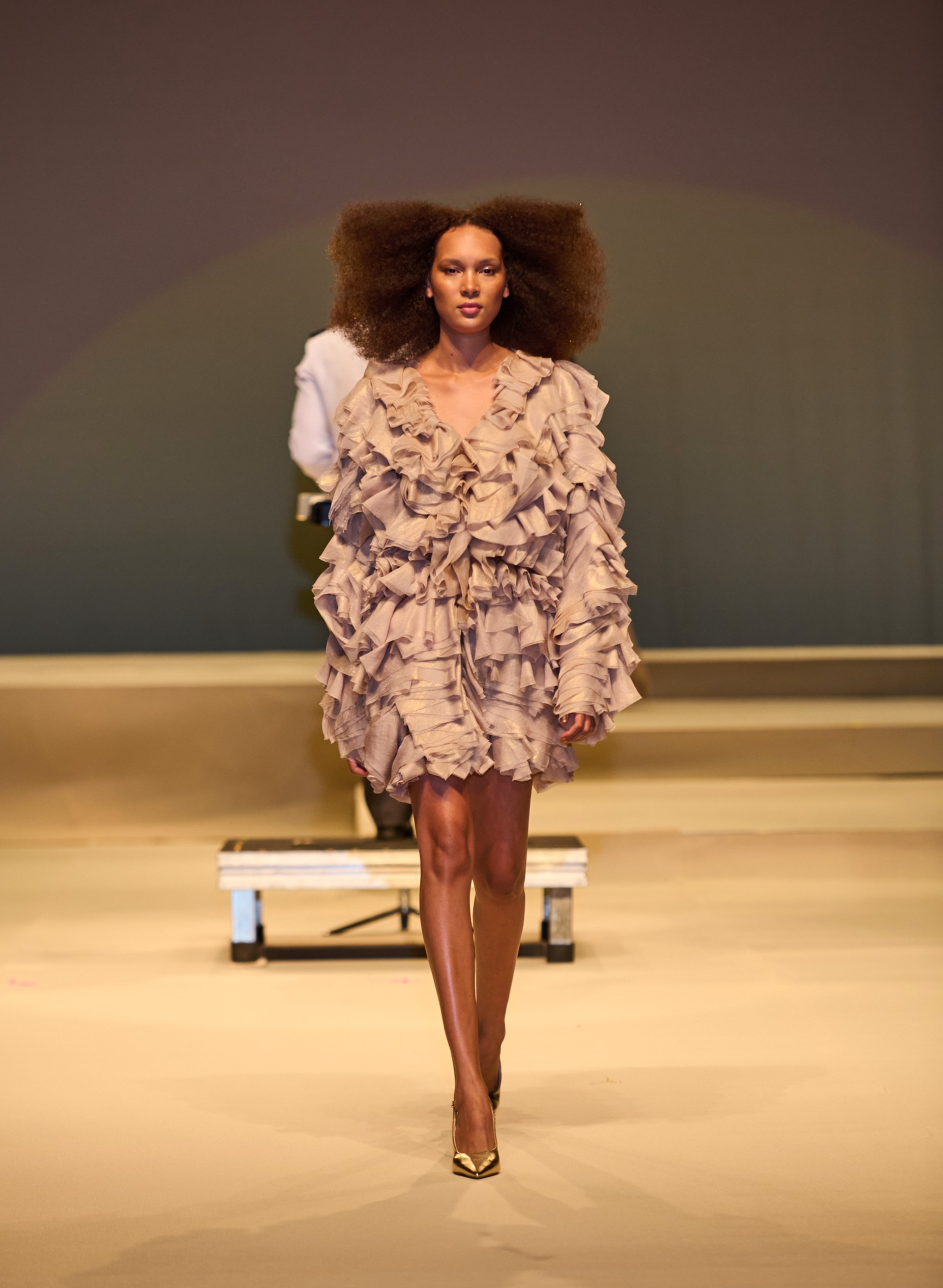 Na passarela, uma sequência de looks autorais trouxeram referências ao artesanato do Vale do Jequitinhonha, às pedras naturais, aos bordados, aos traçados e à cestaria. As produções, cada uma assinada por um designer, começaram em tons claros, como off-white, e evoluíram para nuances de marrom, caramelo, dourado, vermelho e terracota. Volumes amplos, tecidos fluidos e modelagens que favorecem o balanço dos corpos revelaram um retrato sensível e elegante do feito à mão mineiro.