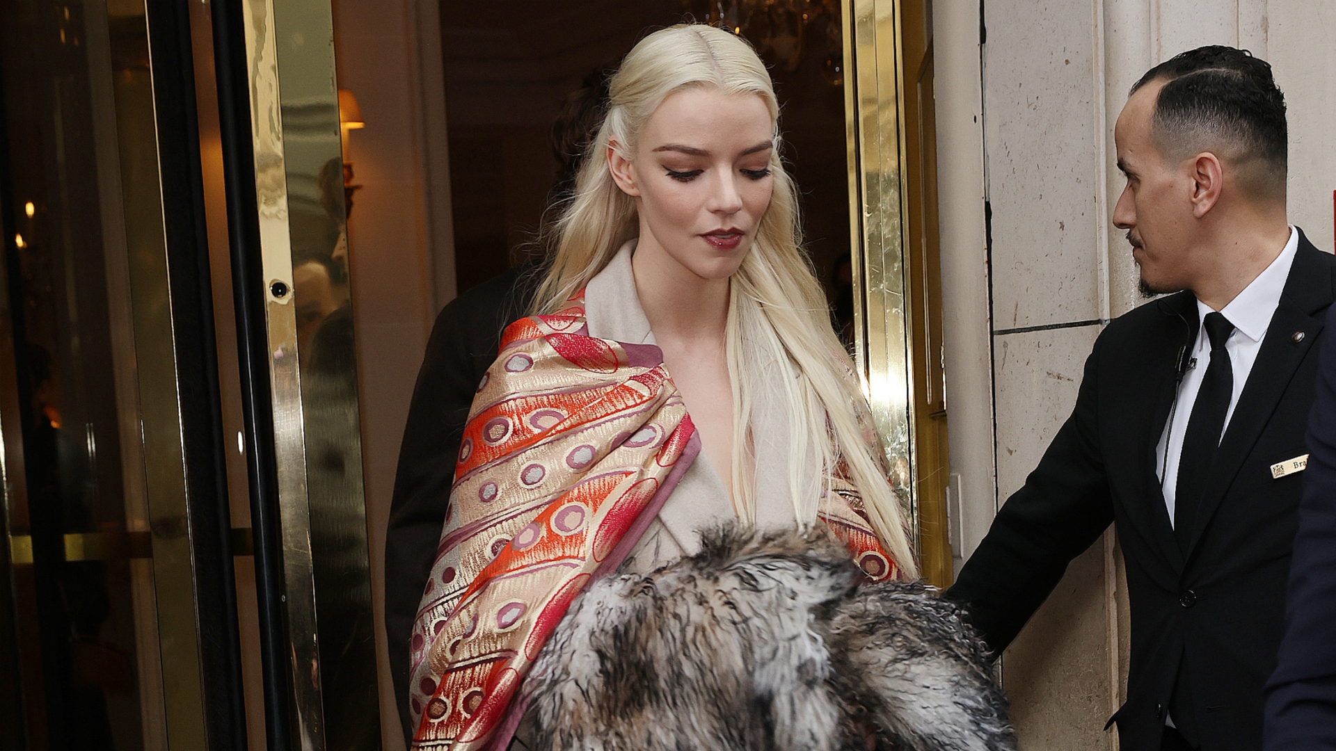 Na sequência, Anya Taylor-Joy elevou o nível do glamour com uma proposta mais ousada e cheia de informação de moda. A atriz investiu em estampas, texturas e sobreposições super bem pensadas! O sobretudo bege ganhou nova leitura com uma echarpe de pelugem e um lenço estampado, que trouxe cor ao look. Nos pés, sapatos clássicos em tom neutro alongaram a silhueta e mantiveram a produção sofisticada.