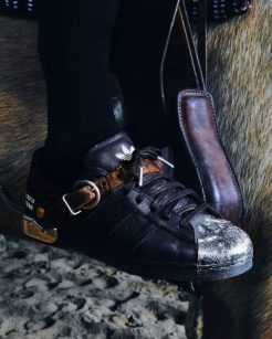 A paleta de cores aposta em tons terrosos, preto, verde oliva e nuances neutras, trazendo a conexão com a vida ao ar livre e o imaginário Western reinterpretado para o contexto urbano. Ademais, os logos da Adidas aparecem de forma sutil, integrados aos gráficos e às mensagens visuais da coleção, criando um diálogo equilibrado entre performance esportiva e moda autoral.