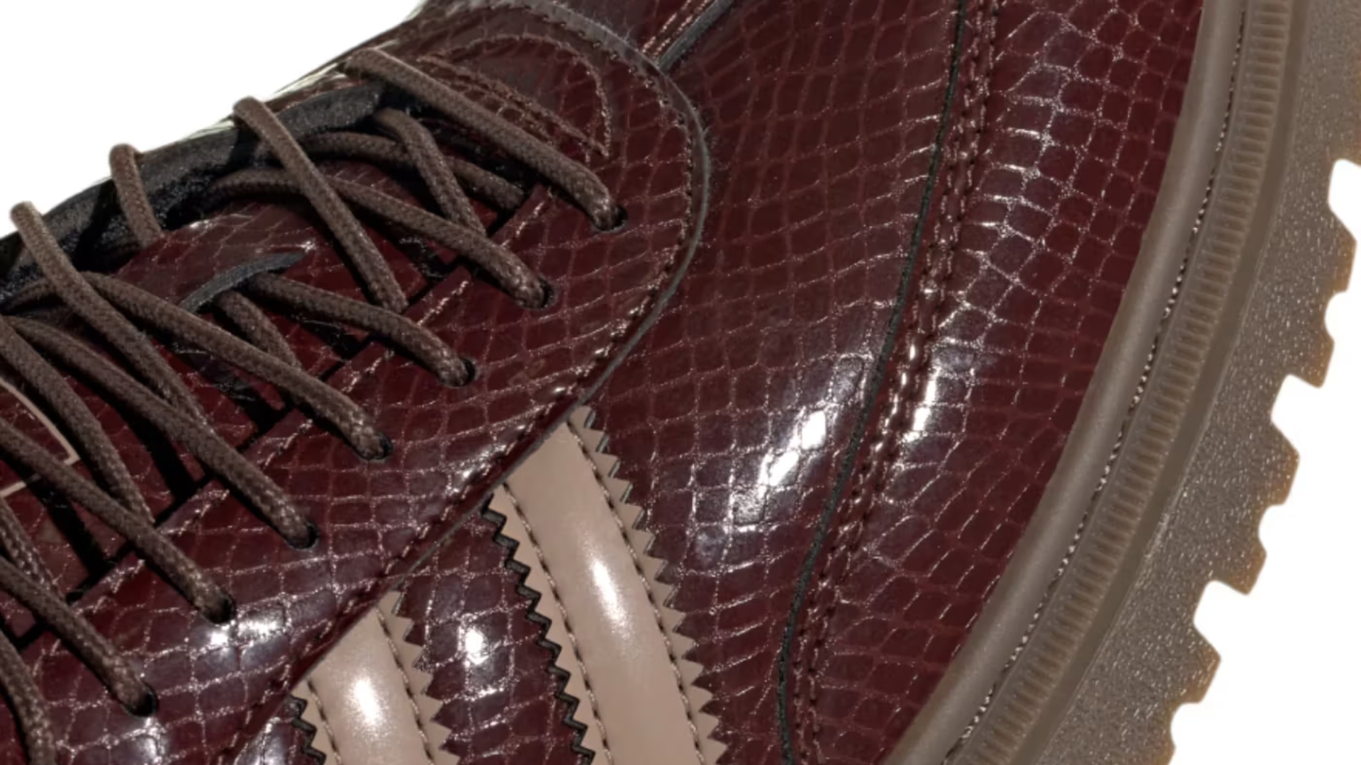 De acordo com o Hypebeast, o cabedal em material sintético imita o couro com textura de croco, totalmente revestido por um acabamento marrom-vinho de alto brilho. Além disso, as famosas três listras serrilhadas surgem em um suave tom marrom latte e se destacam sobre o acabamento sintético envernizado com textura de crocodilo.