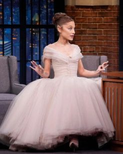 O estilo de Grande para essa ocasião não deixou a desejar. Para a apresentação, ela usou um vestido volumoso retirado dos arquivos de Vivienne Westwood, confeccionado com camadas de seda tafetá e tule da coleção de Outono/Inverno de 2005.