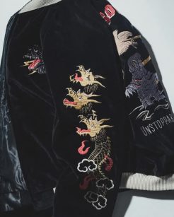 A jaqueta é confeccionada em veludo preto, que serve como uma canvas para impressionantes bordados. Na parte frontal, destaca-se um embate entre as icônicas figuras de Godzilla e Mechagodzilla, enquanto as mangas apresentam o temido King Ghidorah. Famoso por suas três cabeças ameaçadoras. Nas costas, a complexidade do design se intensifica, retratando Rodan e Mothra em um voo sobre o majestoso Monte Fuji. Todos complementados pela imagem de Hedorah, o monstro associado à poluição, logo abaixo.