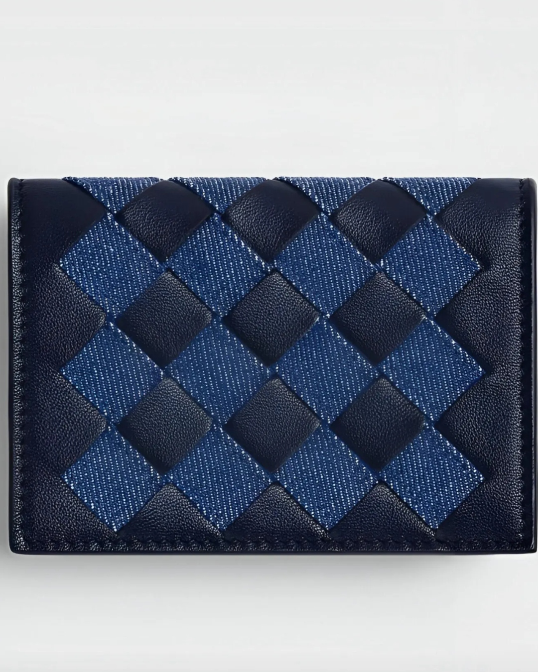 O resultado é um porta-cartões de visita que mistura couro preto trançado com jeans azul-escuro, criando uma estética sofisticada com toque casual. O acessório marca uma estreia importante para a grife, já que, até o momento, é a única peça do catálogo a explorar essa combinação de materiais.