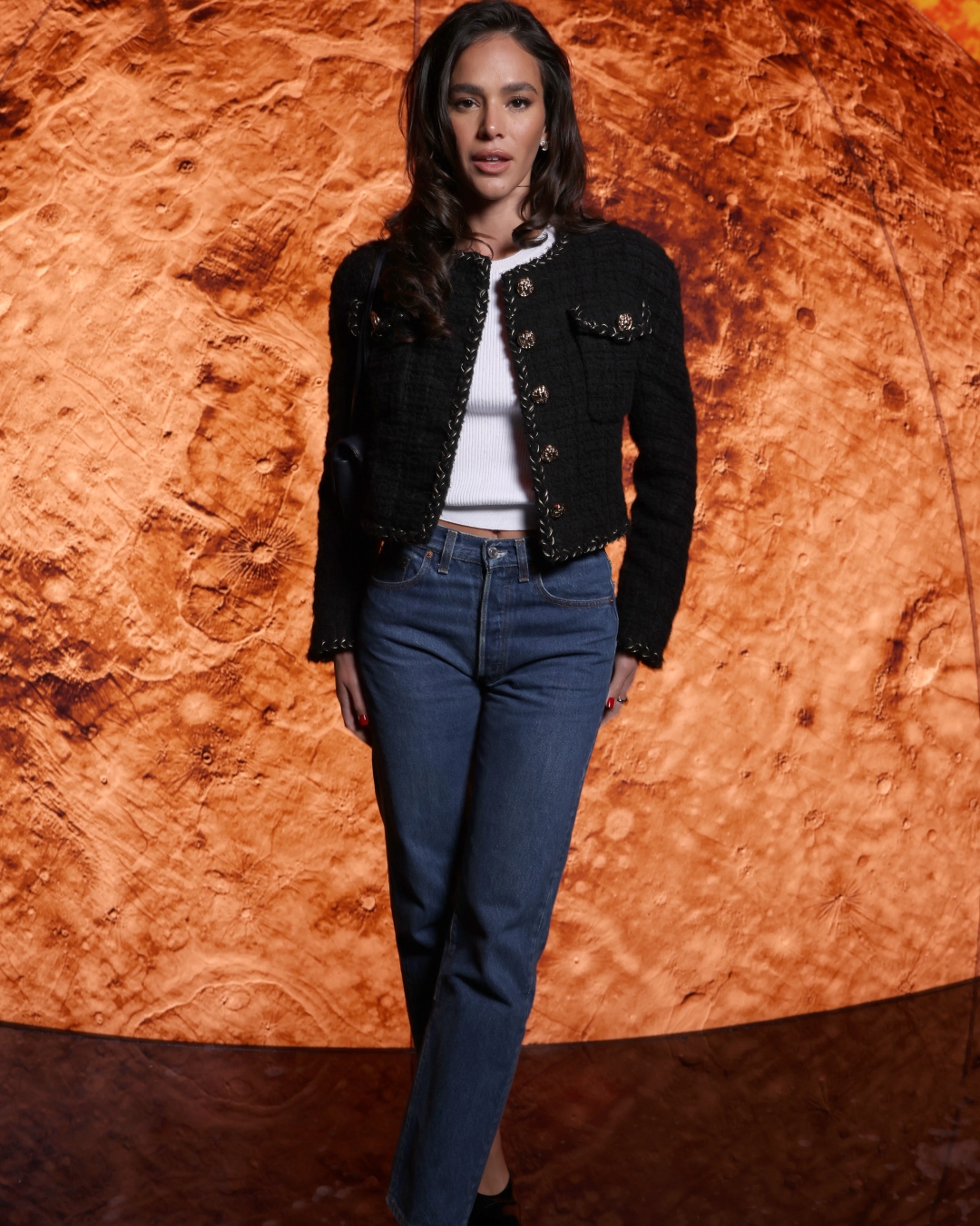 Optando por um visual que mescla casualidade e sofisticação, Marquezine vestiu uma calça jeans de corte reto, um modelo vintage da maison francesa, combinada com uma blusa branca justa. Além de uma jaqueta preta estruturada em tweed adornada com botões dourados.