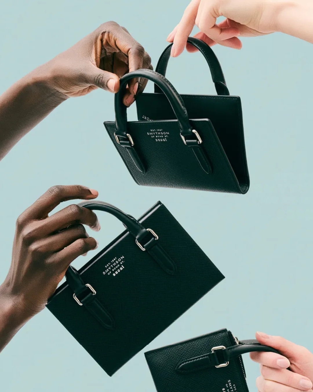 A coleção cápsula apresenta três itens essenciais: um porta-passaporte, uma pequena bolsa (pouch) plana e o icônico caderno Chelsea. Todas as peças são produzidas em couro Panama preto, material clássico da Smythson reconhecido por sua textura e resistência. Mas, o grande diferencial está na estrutura: cada item ganhou pequenas alças rígidas, com inspiração nas pastas executivas da marca britânica. Isso permite que os usuários carreguem na mão como uma mini bag.