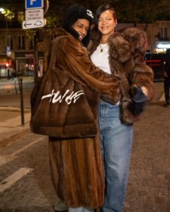 Na noite parisiense, os dois exibiram uma sintonia fashion impecável, apostando em casacos de pele marrom, que se tornaram o ponto alto dos looks. Rihanna escolheu um modelo mais curto e com ombros estruturados. O destaque ficou por conta da gola de pele volumosa, que adicionou textura e sofisticação à produção. Além disso, ela usou uma blusa branca básica e jeans de corte reto, criando um contraste entre o casual e o glamouroso.
