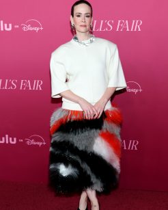 Já Sarah Paulson escolheu um visual conceitual e sofisticado da Bottega Veneta, também da coleção primavera 2026. O vestido combinou uma blusa branca estruturada, com mangas curtas e shape quadrado. Além disso, a produção contava com uma saia texturizada em tons de vermelho, preto, cinza e branco. Segundo o WWD, a mistura de formas e cores trouxe impacto visual ao look, cuidadosamente escolhido pela stylist Karla Welch.