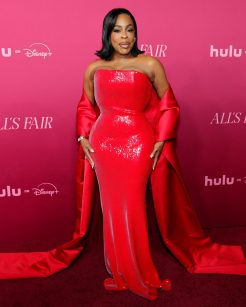 Niecy Nash chamou atenção com um look vibrante da coleção resort 2026 de Sergio Hudson. O vestido tomara-que-caia vermelho, todo em tecido brilhante, ganhou ainda mais destaque com um xale volumoso de cetim, elevando o impacto fashion da produção.