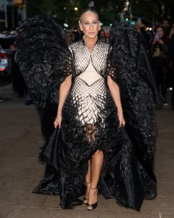 Mesmo com a ausência dos dançarinos, os convidados mantiveram o nível. Sarah Jessica Parker, sempre um ícone da noite, surgiu com um vestido marcante da estilista Iris Van Herpen, em tons de vermelho e com uma cauda fluida que roubou a cena. As “asas” removíveis da peça foram pensadas especialmente para o conforto no teatro — sem perder o toque dramático.