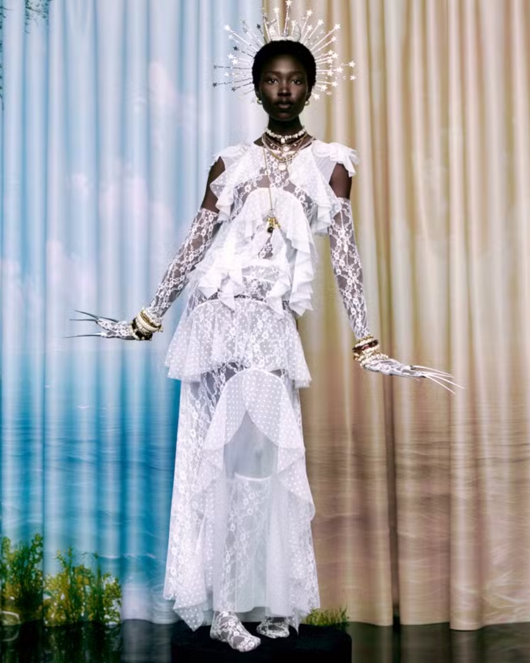 Além disso, parte das peças da coleção é resultado do trabalho direto das artesãs de Timbaúba, enquanto outras incorporam as habilidades técnicas dessas profissionais. Aliás, Patinha, uma parceira frequente de Helô e criadora por trás dos desenhos dos bordados e rendas, também contribuiu significativamente para a coleção.