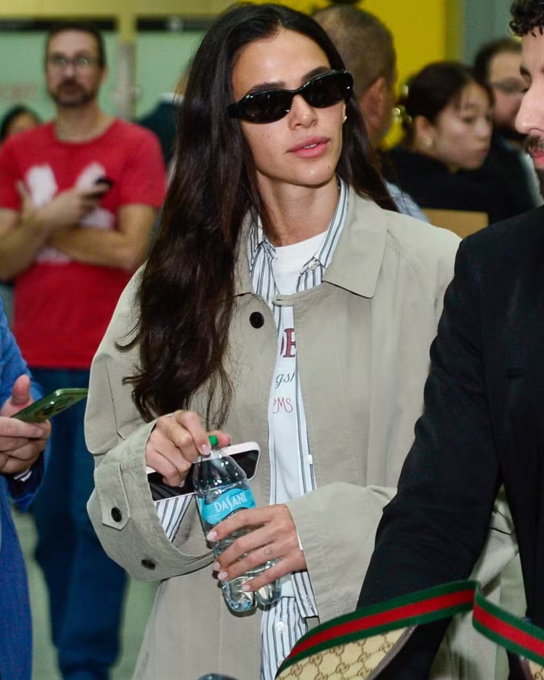 A atriz surgiu no Aeroporto de Cumbica, em Guarulhos (SP). Para a viagem, ela escolheu um trench coat oversized em tom bege claro e uma bolsa da Gucci, modelo Giglio, de acordo com a Quem. A peça da Gucci foi apresentada pela primeira vez no desfile da coleção Cruise 2026 em Florença.