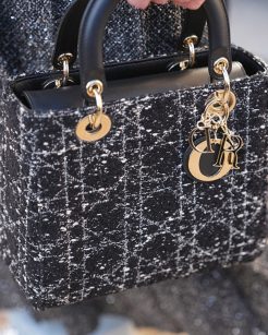 O modelo contém referências diretas ao cannage, o padrão de costura inspirado nas cadeiras Napoleão III do ateliê de Dior. Ademais, se destacava por sua forma reta, rigidez estruturada e detalhes metálicos com as letras D-I-O-R penduradas nas alças. Um elemento que, pouco depois, se tornaria parte de sua assinatura.