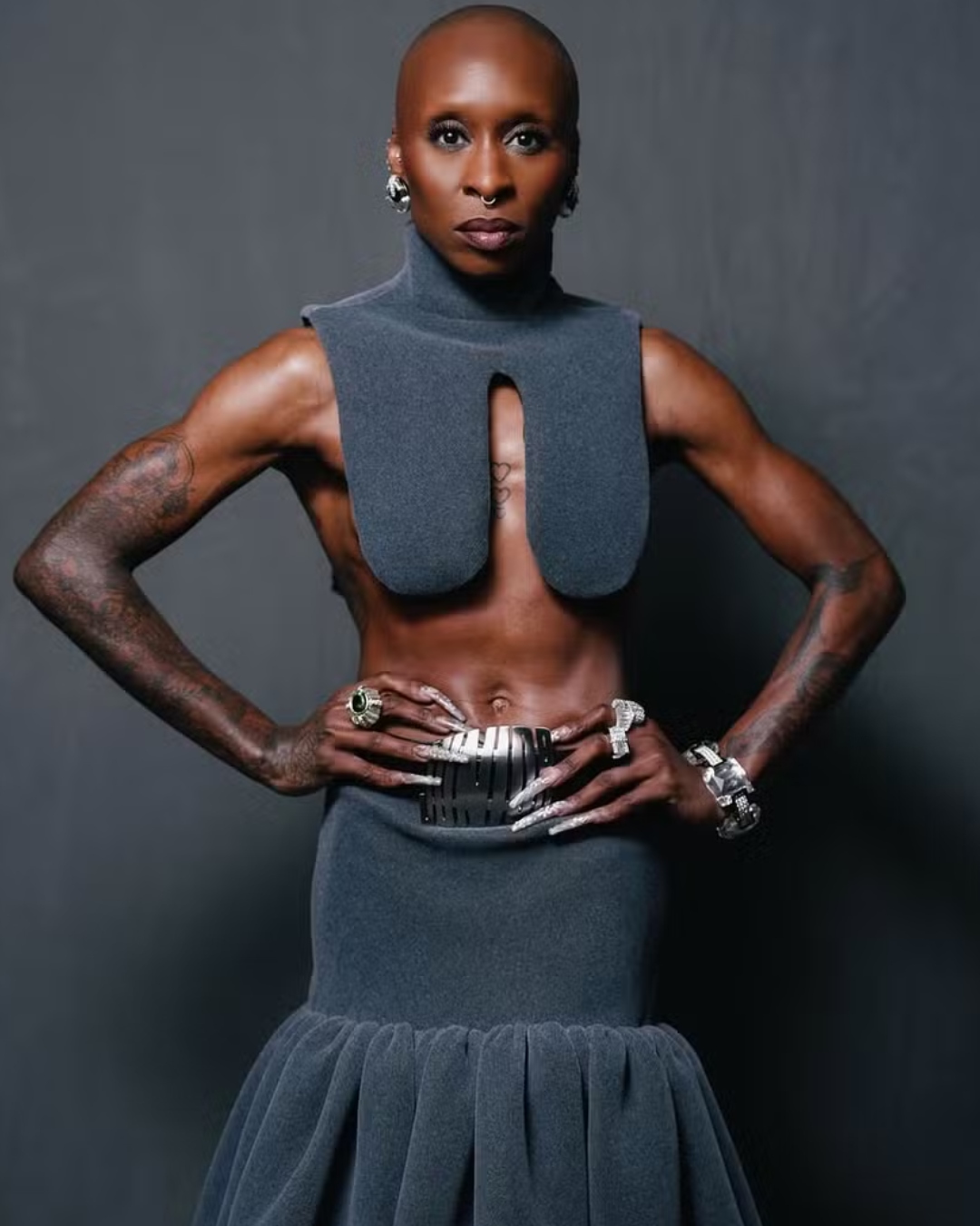Cynthia optou por um look impactante assinado pela grife Jean Paul Gaultier. A peça principal consistia em um top de design arquitetônico, com gola alta que expunha seus ombros e evidenciava seu abdômen tonificado. A saia, com caimento escultural e pregas volumosas, proporcionava um equilíbrio visual marcante ao conjunto.