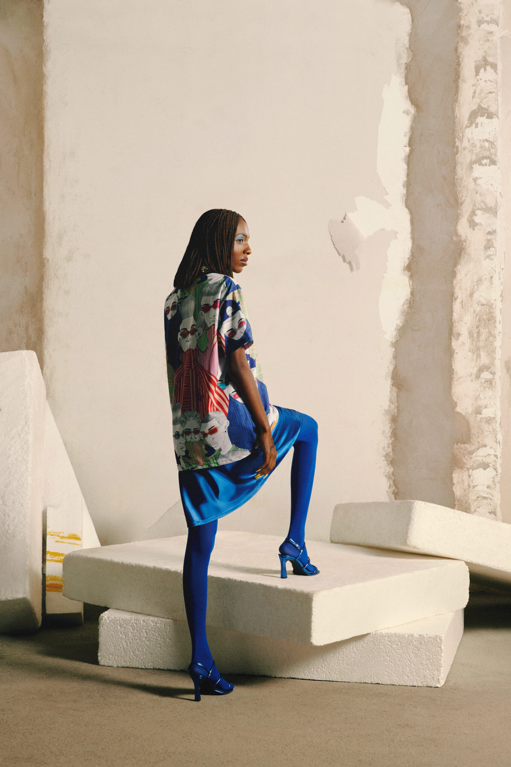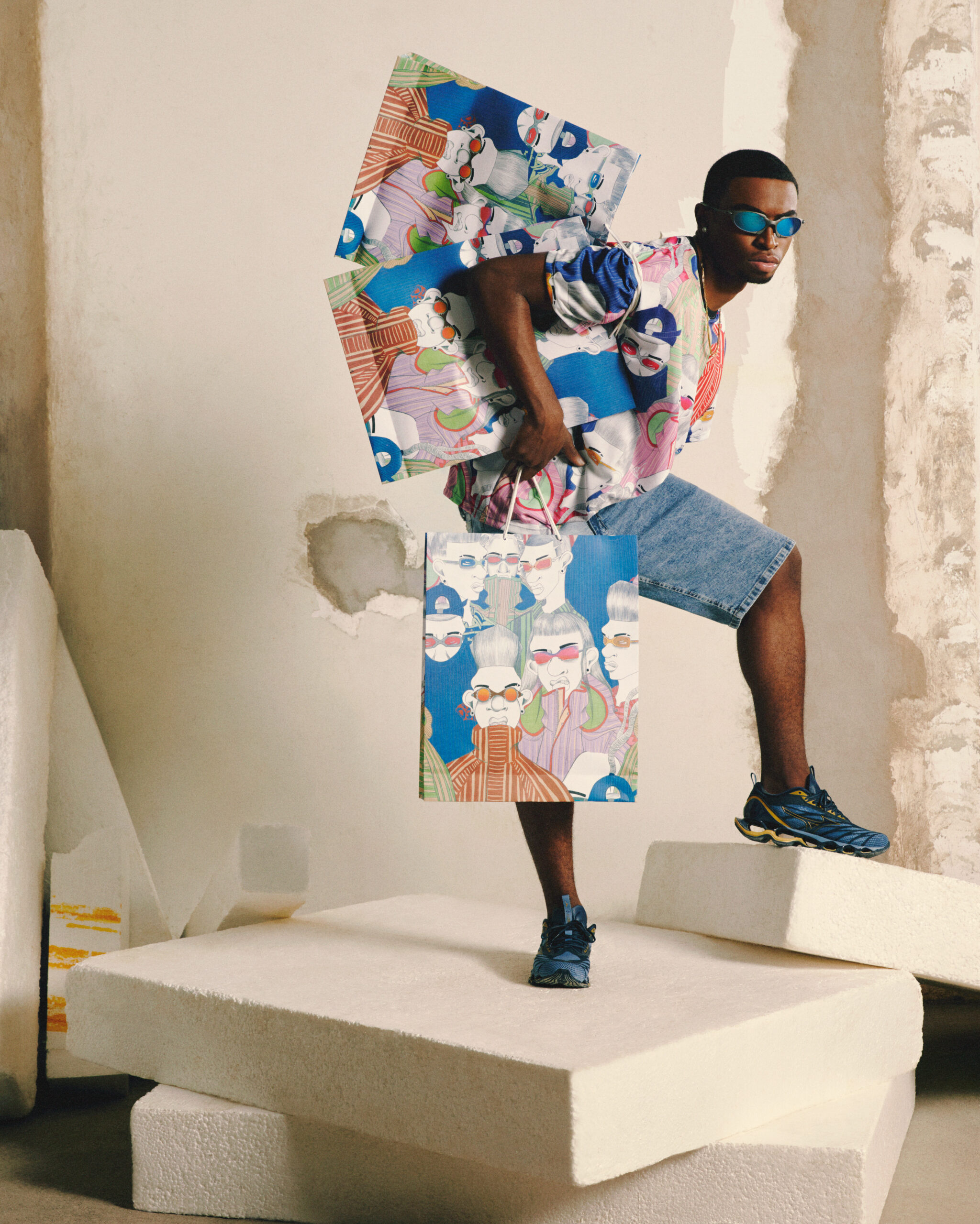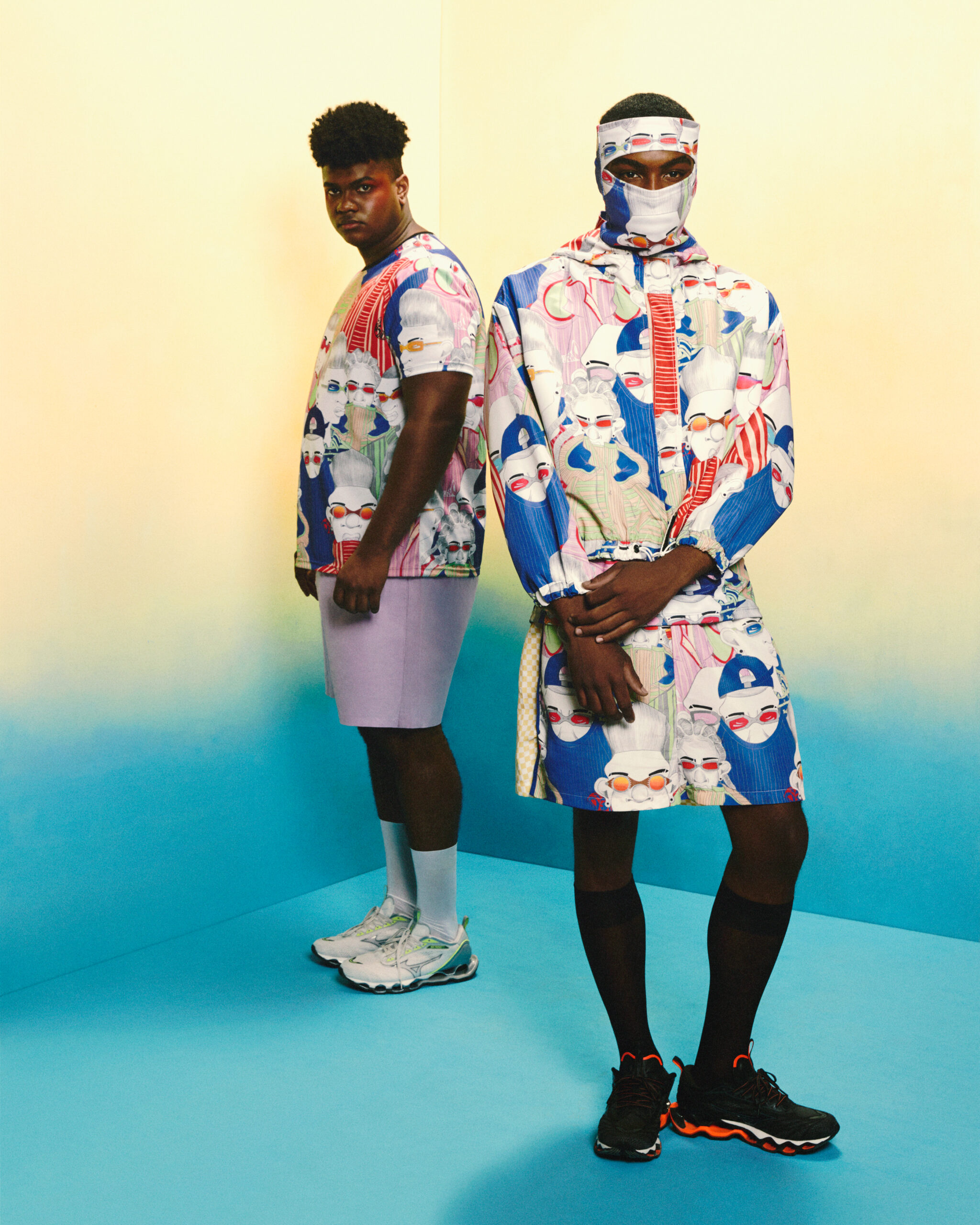 “A construção das estampas com a equipe da Vista foi algo bem tranquilo e livre. Foram várias conversas e apresentações para chegarmos nesse resultado final, um trabalho de fato com muita troca. A partir daí quis retomar o estudo dos retratos dando mais ênfase nas listras. Todas as personagens dentro da estampa tem em suas peças de roupa o padrão listrado, vejo na listra um movimento que se encaixa com o dinamismo de hoje.” comenta ele.