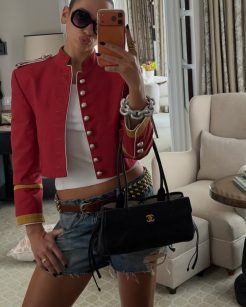 Em seguida, Lipa compartilhou uma selfie no espelho usando um impressionante casaco militar vermelho da coleção Primavera/Verão 2026 de Ann Demeulemeester. Com ombros marcantes, ombreiras, botões prateados robustos e detalhes dourados nas mangas, essa peça destacou-se pelo seu corte boxy e cropped. Ainda contrastando com uma regata texturizada da MM6 Maison Margiela que estava por baixo.