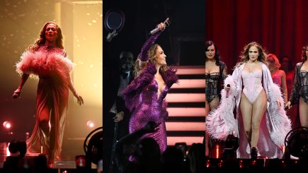 Em um momento marcante, Lopez impressionou a plateia vestindo um vestido roxo brilhante da marca The Blonds. Este complementado por luvas combinando e um manto de penas da Atelier Biser. Para exibir seu físico esculpido, ela também utilizou diversos sutiãs brilhantes e minissaias, segundo a Harper’s Bazaar US.