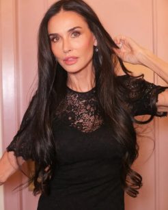 Demi Moore aposta em vestido preto da Gucci com detalhe delicado e joias de diamante