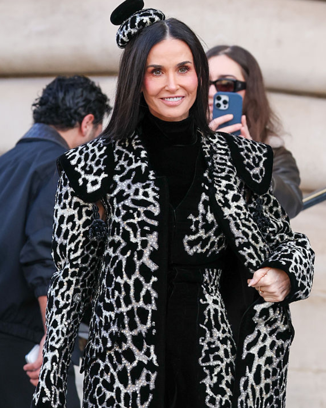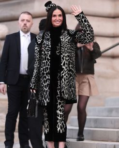 A atriz Demi Moore aposta em animal print sofisticado e silhueta dramática para prestigiar desfile em Paris, combinando estampa e brilho