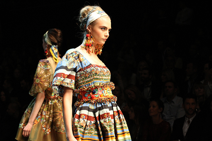 Num tempo em que as imagens de referência pipocam na internet como micróbios em reprodução, as raízes tradicionais, informações mais concretas sobre um tipo de vida e estética, enfim, tudo aquilo que foi conservado por mais tempo, permanece. O que existia antes da internet, ou que ainda encontramos em contextos menos globalizados e de certa forma mais puros, nos transmite uma facilidade de identificação. Essa é a Itália da qual lembram bem os italianos, e que ainda existe, produz comida, cerâmica, turismo. É daí que saiu essa mulher Dolce & Gabbana que vimos na passarela: colorida, enfeitada, feminina e tradicional.