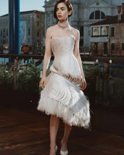 A construção arquitetônica do vestido é hipnotizante, mas o detalhe das penas de avestruz que adornam a barra eleva a peça ao reino do fantástico. Este tipo de alta-costura se destaca em fotografias sob diferentes ângulos, apresentando uma estética suave e surreal. Ademais, Lily brilha especialmente em trajes que equilibram romance e precisão.