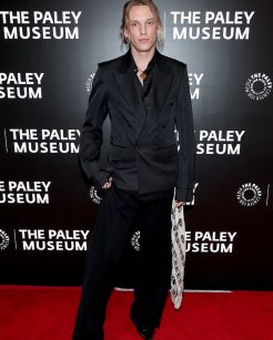 Jamie Campbell Bower também fez parte do time McQueen, exibindo um look que unia sofisticação e conforto. Ademais, o uso de um lenço com estampa de caveira trouxe um elemento familiar e descontraído à sua produção, segundo o Red Carpet Fashion Awards.