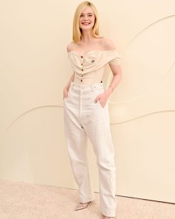 Para completar o visual, Fanning combinou a peça com calças largas em tom claro da coleção primavera/verão 2026 de Andreas Kronthaler para Vivienne Westwood. Ademais, o styling contou com sandálias Louboutin em tom champanhe e uma joia discreta. Sendo apenas uma pulseira Cartier, segundo a Harper’s Bazaar US.