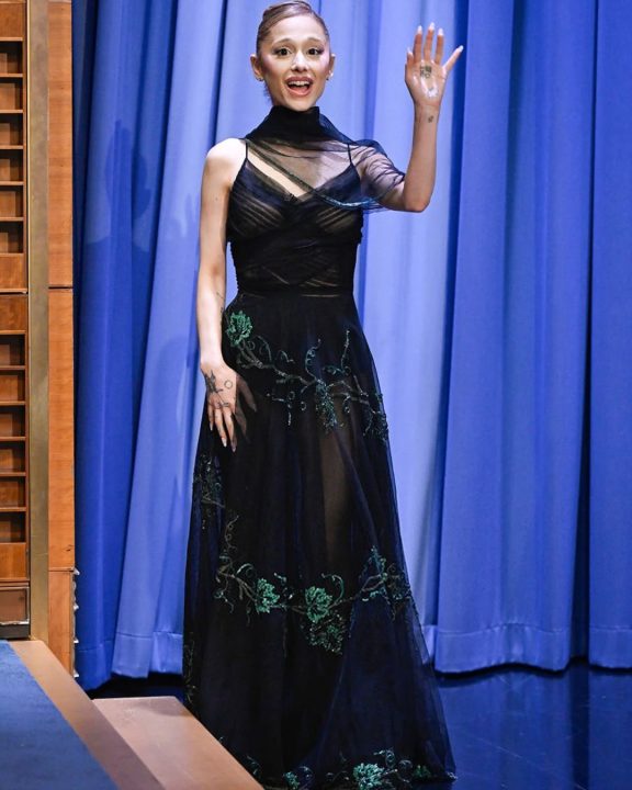 Glinda de Elphaba? Ariana Grande usa peça vintage com esmeraldas em programa de Jimmy Fallon