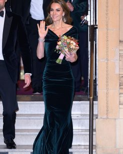 Para a ocasião, Kate optou por um design elegante e festivo, da grife Talbot Runhof. O vestido de veludo verde escuro contava com uma saia mermaid levemente ajustada ao corpo e um decote profundo. A parte do corpete apresentava um detalhe que dava a impressão de que ela usava uma sobreposição combinando, mas na verdade era uma peça única.