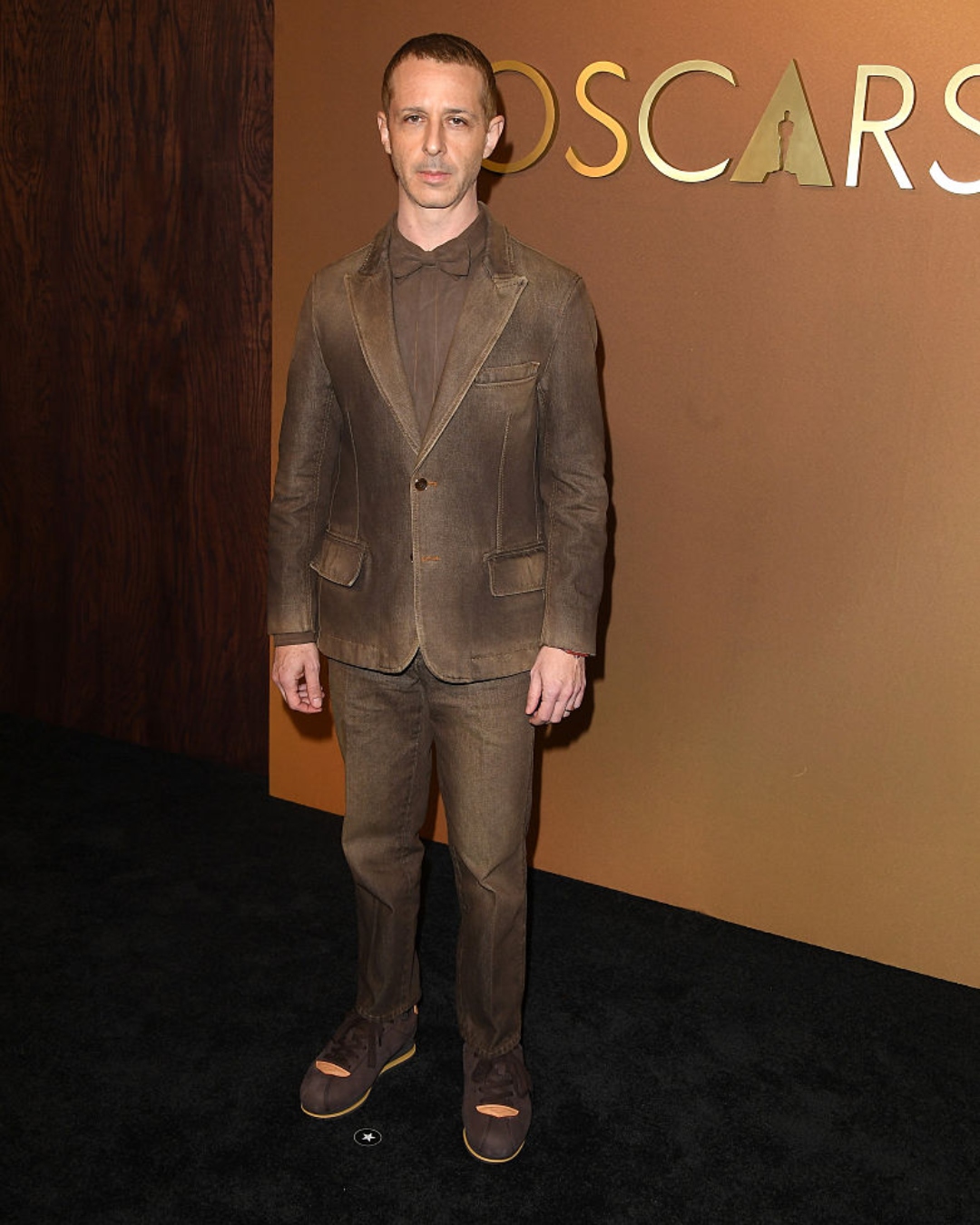 Jeremy Strong surgiu em um smoking clássico e surpreendeu a todos ao optar por um traje denim Louis Vuitton na cor café, segundo o Red Carpet Fashion Awards. Também com gravata borboleta combinando e tênis Buttersoft da mesma marca.