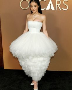 Chase Infiniti também fez uma aparição notável em um vestido customizado da Louis Vuitton, mas gerou opiniões divergentes. Enquanto o corpete do vestido é indiscutivelmente bonito e apresenta um trabalho artesanal de qualidade, a saia de tule se afastou do ideal desejado e acabou remetendo a comparações infelizes. Uma forma mais suave ou um volume menos abrupto poderiam ter evitado essa impressão. Joias da MESSIKA complementaram seu visual.