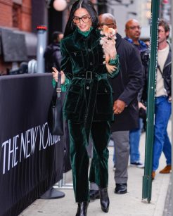 A atriz americana estava com uma jaqueta Saharienne em veludo, combinando com a calça, também em veludo. Já a blusa, embaixo da jaqueta, era de sena. No entanto, para completar o visual, Demi Moore apostou em botas plataforma Nico em couro liso.