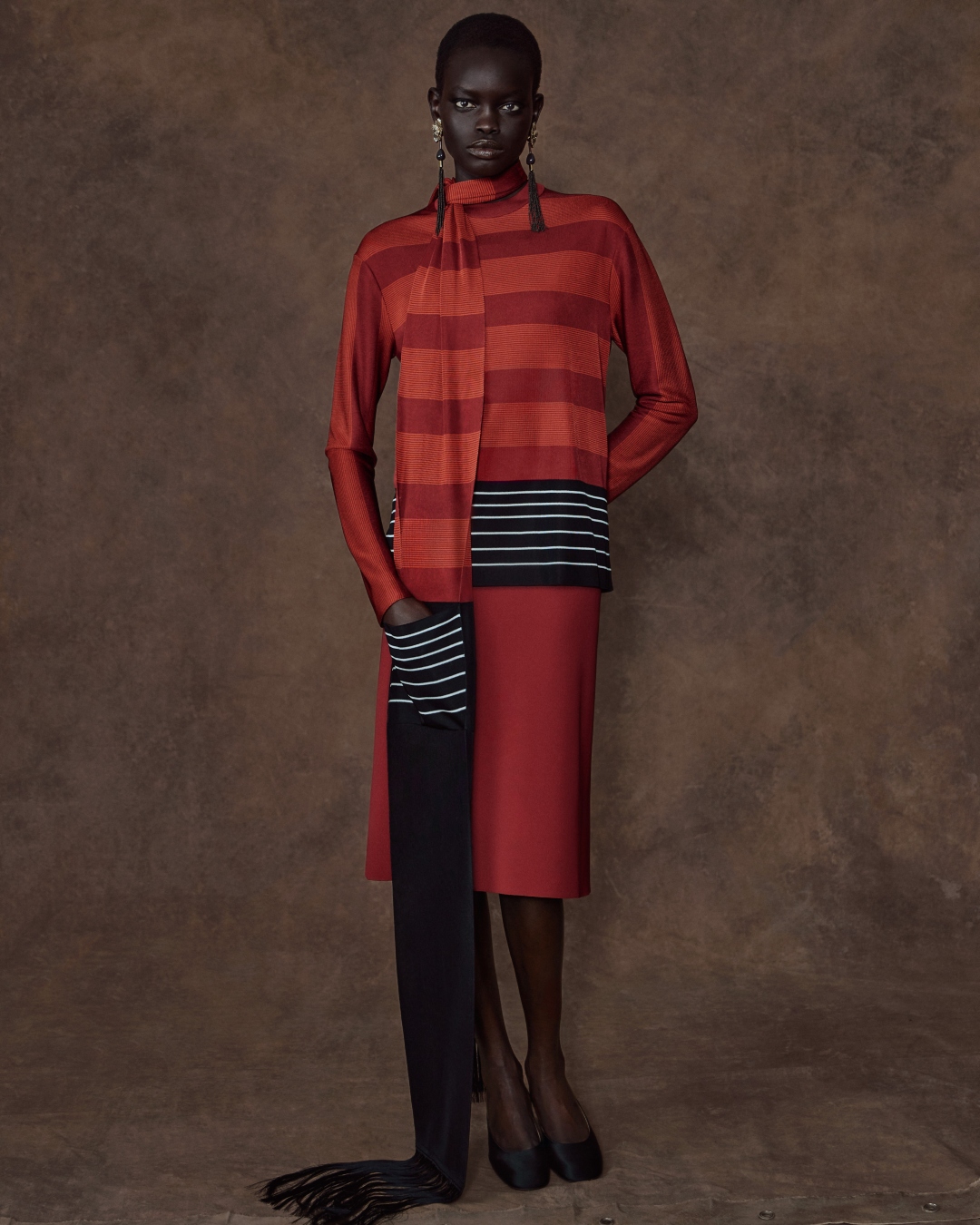 A coleção traz listras náuticas resgatadas dos arquivos da grife, vestidos em seda com drapeados fluidos, tricôs leves, tecidos bouclé e uma paleta vibrante inspirada no Caribe. Referências ao universo náutico aparecem de forma sutil e contemporânea, equilibrando herança e modernidade.
