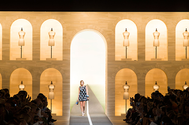 Uma mistura de caverna, deserto e parquinho infantil, a cenografia da Prada foi a mais impactante. Realizada pelo escritório AMO, parceiro de longa data da marca, ela questiona a relação entre outdoor e indoor. As 15o toneladas de areia de parques infantis invadem o espaço e mudam as proporções do lugar, causando um efeito inesperado. As modelos caminhavam ao redor dessas dunas violetas. E para tirar o ar mesmo de quem entrava, o público, ao chegar na sala, tinha que subir uns degraus que davam uma vista panorâmica do cenário. Um show à parte. Na trilha, som do projeto da banda Psychic Tv, um grupo de música e videoart que faz uma música mais experimental.