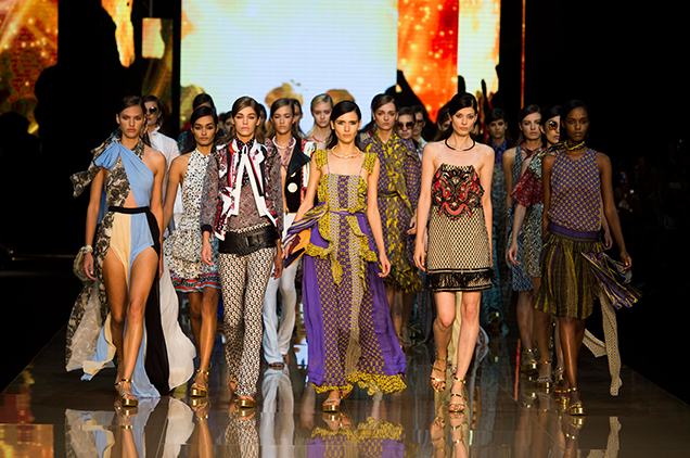 Também hoje outro dinossauro da moda italiana desfilou sua segunda marca. Roberto Cavalli apresentou a coleção da Just Cavalli no suntuoso Arco della Pace, monumento milanês do Parco Sempione, o parque mais famoso da cidade. A aglomeração em volta também é um clássico. Principalmente nas mesinhas da Pizza Ok, bem na frente. Entrando na sala de desfile vemos já Cavalli em ação: falando com a imprensa ou com os convidados mais queridos. “As palavras da estação são amor, liberdade e sexo, que têm tudo a ver com a juventude. E minha marca é jovem. Gosto de me inspirar com música alta”, comentou com jornalistas antes do desfile começar. Os looks vieram românticos, tecidos bem esvoaçantes à la Cavalli. Mas a trilha de balada parecia pedir algo mais sexy. O casting era delicado. + Veja a coleção completa aqui