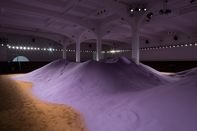 Um deserto violeta criado pelo escritório AMO na cenografia da Prada ©Divulgação Prada
